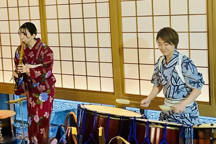 尺八の静かな余韻と、和太鼓の躍動が響き合うひととき。演奏者の息づかいまでもが伝わるその音色は、悠久の時を重ねてきたこの街の気配に、そっと触れるような感覚をもたらしてくれます。