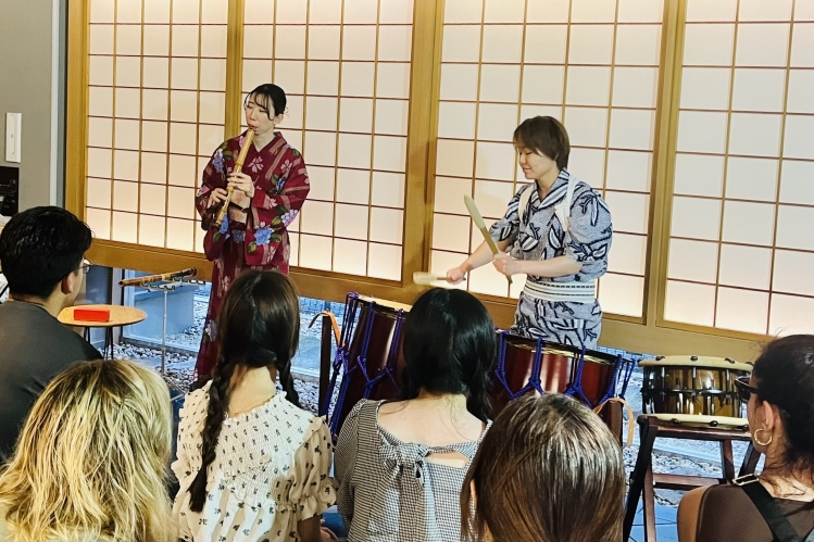 イベントの舞台は、ホテルリソル京都 河原町三条のロビー。演奏者と客席を隔てるものはなく、尺八を奏でる指の動きや、和太鼓を打つ瞬間の気迫までもが、目の前で感じられます。