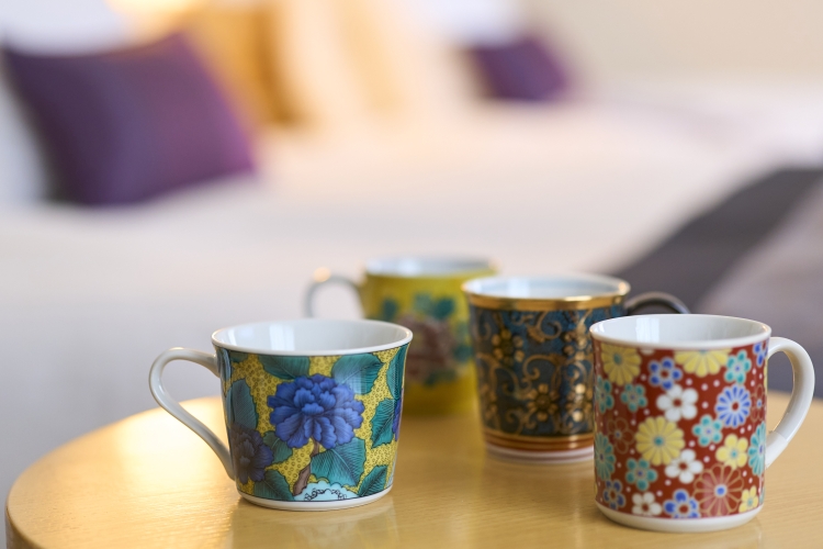 そんな静けさのなかで、ロビーサービスとしてご用意しているのが、九谷焼のマグカップで味わう金箔入りのコーヒー。