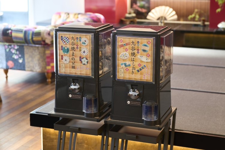 地元では日用品としても使われる器ですが、その美しさをもっと多くの方に知っていただきたくて、ロビーには九谷焼の豆皿やはしおきをカプセルに詰めたガチャガチャもご用意しました。