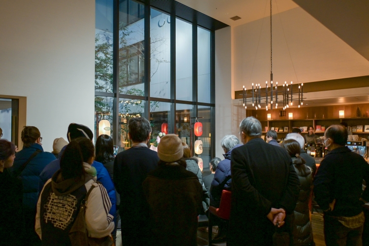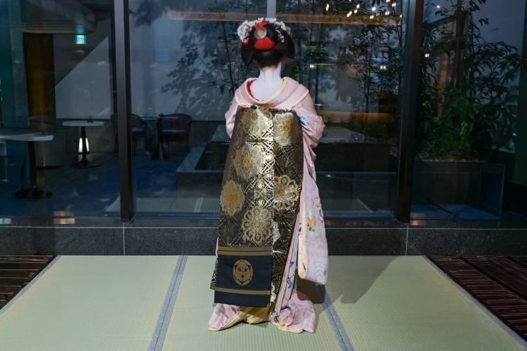 イベントの舞台となるのは、ホテルリソルトリニティ京都のロビー。畳が敷かれた空間には、お茶屋さながらの雰囲気が広がります。三味線や笛の音色が静かに響く中、舞妓さんが登場します。