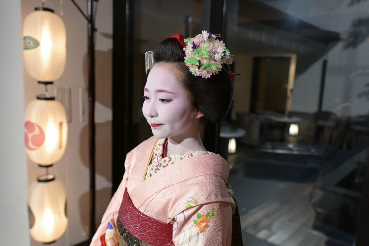 歩く、座るといった所作の一つひとつにまで気が配られており、舞台の一幕を目の前で味わうような臨場感の中、空間全体が舞妓さんの世界に染まっていきます。