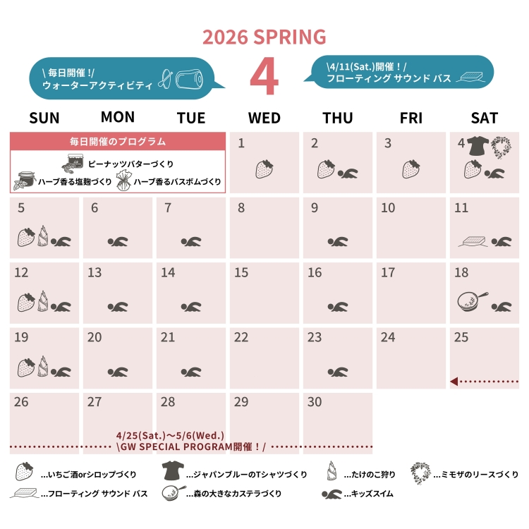 水に浮かび、音を浴びるフローティング サウンド バスをはじめ、BIG SUPやウォーターロールなどの水上アクティビティ、たけのこ狩りやいちご酒・梅酒づくりといった季節の収穫体験、藍の乾燥葉を使ったTシャツ染めやガーランドづくりなど、自然に触れて五感をひらく春限定の体験プログラムをご用意いたしました。