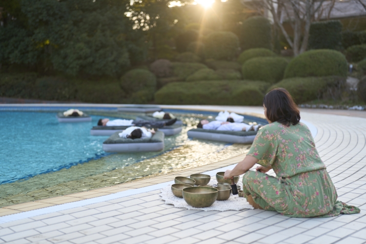 4月11日(土)、4月25日(土)、5月2日(土)、5月4日(月・祝)に、水上ベッドに身をゆだね浮遊しながら音を浴びるウェルネス体験「Floating Sound Bath(フローティング サウンド バス)」を開催いたします。全長130mのリゾートプールに浮かぶ水上ベッドに寝ころび、自然の音と"シンギングボウル"が奏でる癒しの音色を全身で浴びるリラクゼーションです。