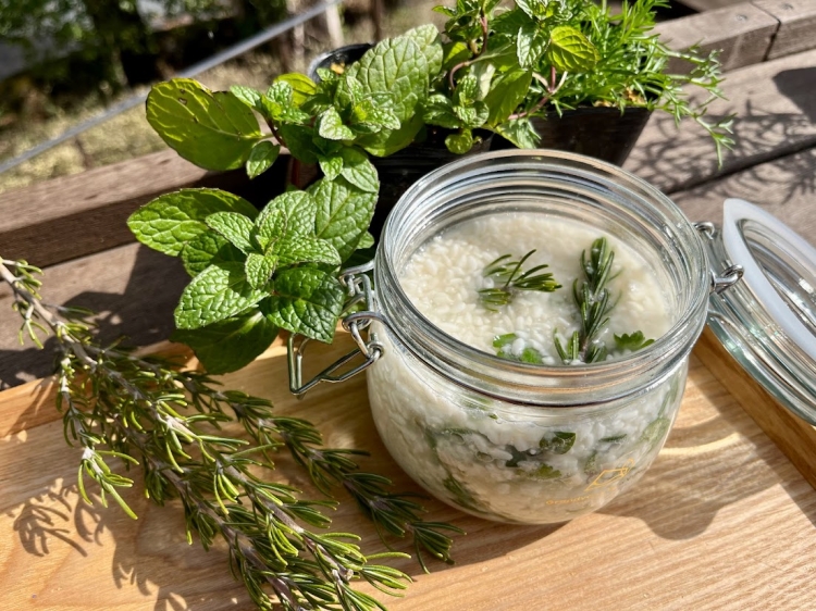 3月21日(土)から6月1日(月)までの期間、グランピングエリア内で栽培したハーブを使って発酵調味料を作る「ハーブ香る塩麴づくり」を開催いたします。塩麴は、善玉菌のエサとなるオリゴ糖を生成する酵素をもち、腸内環境を整える効果がある万能調味料です。ハーブの豊かな香りと、麹ならではのうま味と塩味が合わさり、ワンランクアップしたお肉やお魚、お野菜のお料理を日常の食卓でもお楽しみいただけます。