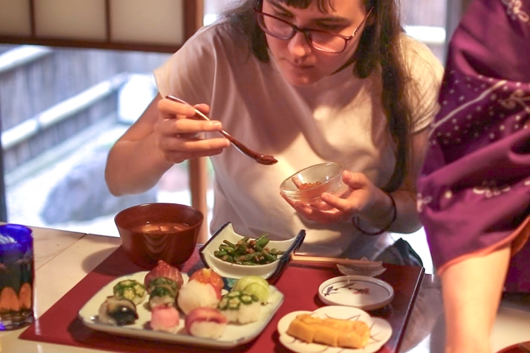 そこに合わせるのは、削った鰹節の出汁︎が香る味噌汁︎。3種類の味噌を味見し、好きなものを選ぶことができるそう。自分で巻く卵焼きや、海外の方にはあまりなじみのない胡麻和えも作り、有田焼や九谷(くたに)焼、江戸切子など日本の伝統的な器たちに盛り付けます。