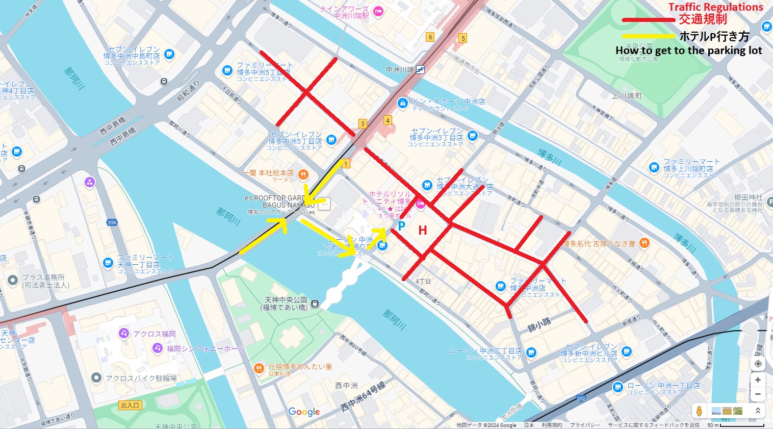 The Nakasu Festival will be held on Friday, October 25 and Saturday, October 26, 2024. As a result, traffic restrictions will be implemented around the hotel on both days.