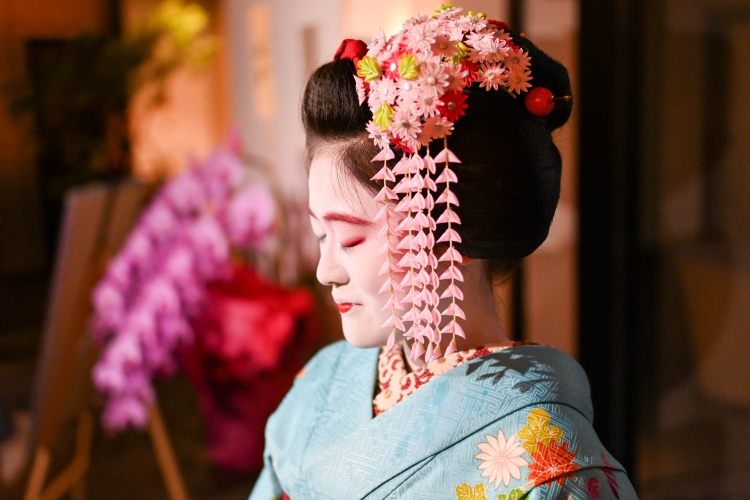歩く、座るといった所作の一つひとつにまで気が配られており、舞台の一幕を目の前で味わうような臨場感の中、空間全体が舞妓さんの世界に染まっていきます。