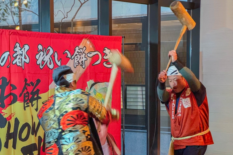 また、パフォーマンスの後にはお餅つき体験に参加することができます。臼と杵でお餅をつく時間は、昔ながらのお正月の情景を思い起こさせ、元旦の旅をより特別ものにしてくれます。